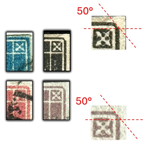 Nella composizione grafica di figura 4 i multipli presentati sono stati allineati in modo da evidenziare come i francobolli nella varietà F20 (C9) si trovino tutti sulla stessa colonna, sempre alla sinistra della varietà C17 (B8) come abbiamo già evidenziato. Nella figura 12 che segue, abbiamo affiancato la porzione superiore sinistra di quattro dei francobolli, per mostrare come appaiano i dettagli Dt299 e Dt300. Si noti inoltre che nel francobollo del valore da 1 crazia, il dettaglio Dt300 è assente, ovvero la cornice non risulta interrotta nel Segmento 2, dimostrando come in questo caso lo stereotipo fosse ancora al Primo Stadio.