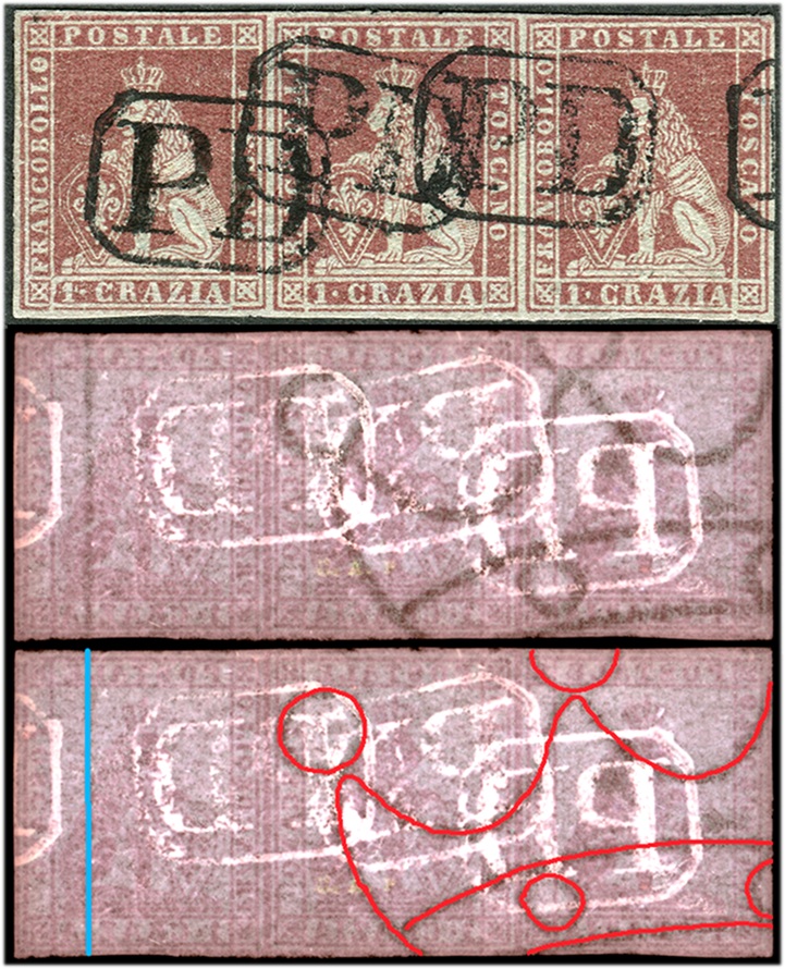 Per completezza, mostriamo anche la filigrana del multiplo che porta il francobollo nella varietà P5 (E13), nella quale si osserva una linea verticale che abbiamo colorato in azzurro e gran pare di una delle dodici corone che componeva la filigrana di Toscana del Primo Tipo, le cui linee abbiamo ritracciato in rosso (figura 22).