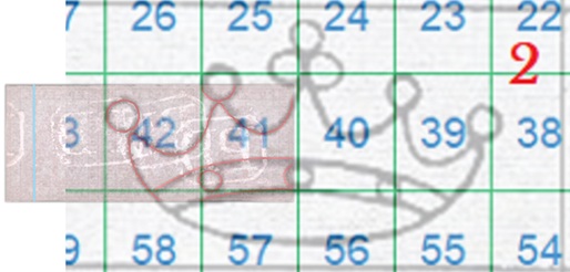 Quella che si osserva nella filigrana di questa striscia è la Corona 2, mentre la linea verticale è quella che separa le Corone 1 e 2. L'impronta della filigrana è infatti osservabile al Verso dei francobolli e le corone sono chiaramente Dritte (VD), il che ci suggerisce di riferirsi alla tavola S01 per determinare le posizioni che gli esemplari occupavano nel quadro di stampa, che, come dimostrato nella figura 23 che segue, erano le 41, 42 e 43.