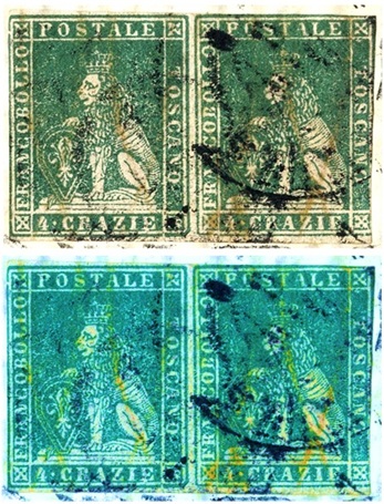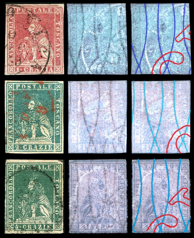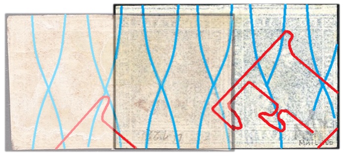 La coppia è ancora aderente alla missiva che affrancava e non abbiamo la possibilità di vedere una sua scansione in trasparenza, per poter studiare la filigrana in modo approfondito. Da ciò che si può osservare dal semplice fronte dei francobolli, si suppone comunque che la filigrana non sia del tipo fil-let. Si osservi infatti come la colla che tiene aderente la coppia al supporto cartaceo, sia migrata al fronte laddove la carta è più sottile, ovvero in corrispondenza delle linee della filigrana, creando intense sfumature brunastre, che abbiamo cercato di evidenziare con l'animazione di figura 28. Nella porzione inferiore dell'immagine riportiamo una versione grafica della coppia a cui abbiamo alterato i colori, in modo da evidenziare le linee della filigrana, che appaiono in giallo. Da queste tracce, non si osservano possibili tratti riconducibili alla componente letterale della filigrana.