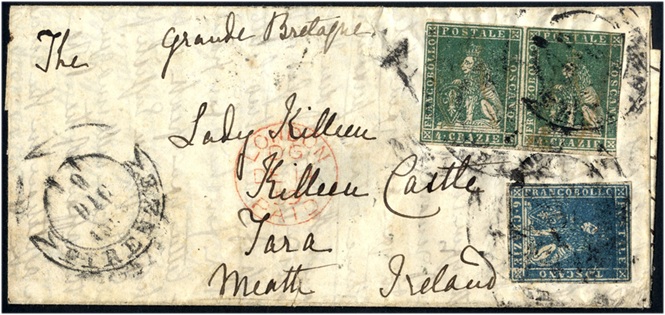 In figura 30 mostriamo la missiva dalla quale abbiamo ripreso la coppia del valore da 4 crazie, spedita da Firenze il 9 di Dicembre del 1959, con destinazione “The Grande Bretagne” a Lady Killeen presso Killeen Castle a Tara nella contea di Meath in Irlanda. Visibile anche il bollo di arrivo in Gran Bretagna a Londra il 14 di Dicembre.
