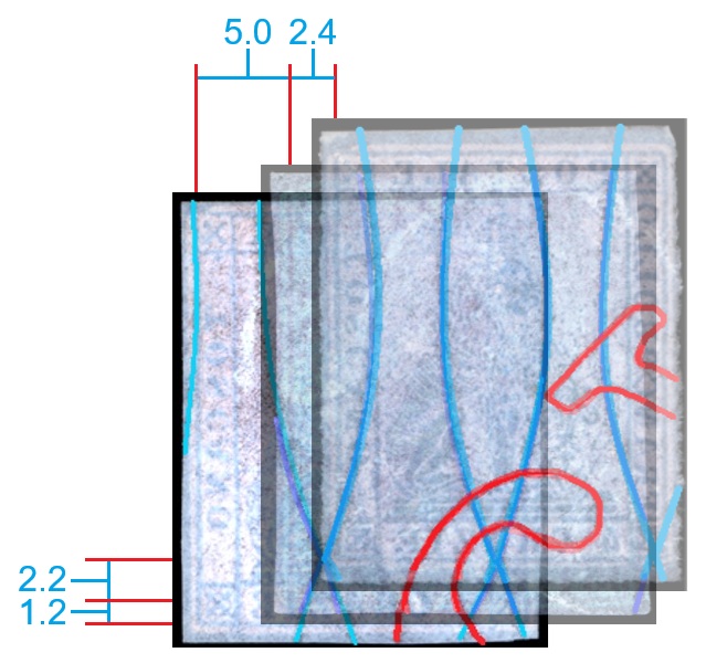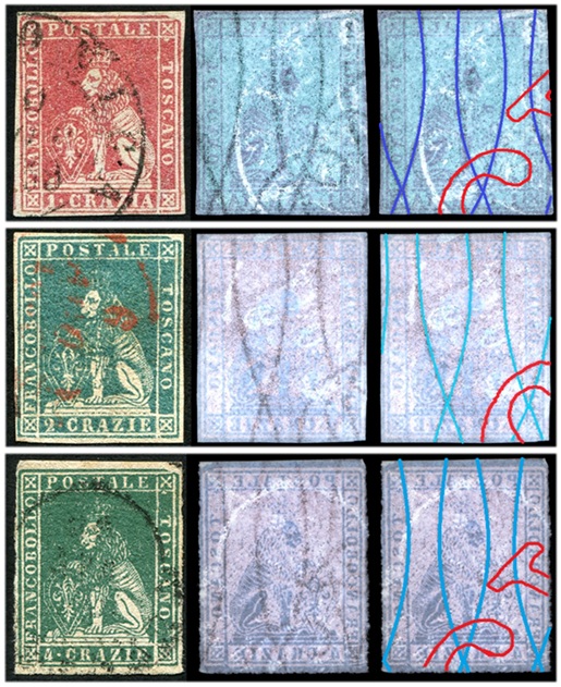 Come si può osservare, la filigrana dei tre francobolli appare non perfettamente uguale, nonostante si tratti della stessa posizione del foglio di stampa e della stessa configurazione della filigrana. Ciò è dovuto al non costante allineamento del foglio rispetto alla matrice di stampa, a quella variabilità frequentemente osservata nella produzione dei francobolli toscani. Nell'immagine che segue di figura 33 abbiamo realizzato una sovrapposizione in trasparenza della filigrana dei tre valori, per mostrare quale sia stato il disallineamento nel posizionamento della carta. Si osserva un disallineamento massimo di 7,4 mm in orizzontale e di 3,4 mm in verticale.
