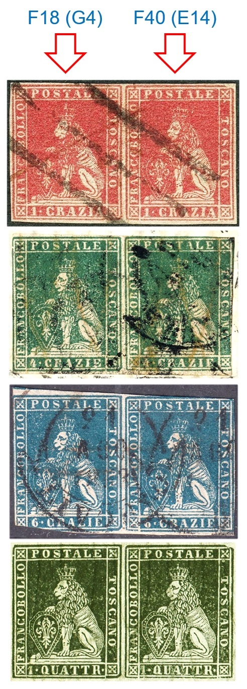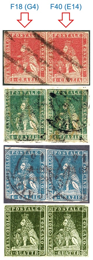 Come dimostrazione ulteriore del concetto di Posizioni Ricorrenti, un fenomeno proprio dei francobolli toscani stampati su filigrana del Secondo Tipo, mostriamo la composizione grafica della seguente figura 34. Tre coppie viaggiate ed una nuova (rispresa dalle posizioni 35 e 36 del blocco nuovo del quattrino), tutte e quattro che portano le due varietà F18 (G4) a sinistra e F40 (E14) a destra, per due delle quali (1 quattrino e 6 crazie) la posizione occupata nel quadro di stampa è certa, la 35 e la 36.