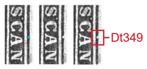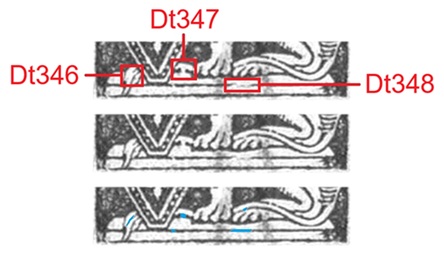 Questa varietà è caratterizzata da almeno quattro dettagli principali, tre dei quali sono localizzati nella porzione inferiore del rettangolo che contiene la vignetta, come graficamente descritto nella figura 35 che segue (Dt346, Dt347 e Dt348).