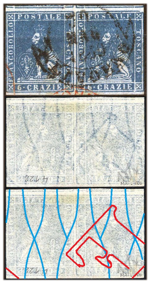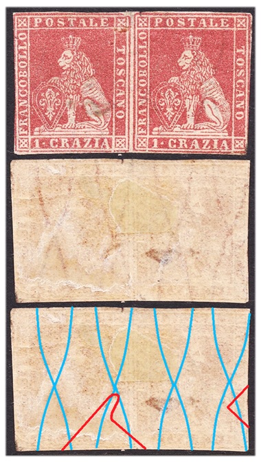 Nella figura 37 che segue riportiamo una coppia orizzontale del valore da 1 crazia su filigrana del Secondo Tipo del tipo fil-let, della quale riportiamo, oltre al recto (fronte) anche il verso, sul quale abbiamo ritracciato le linee della filigrana, in azzurro le linee ondulate verticali intrecciate e in rosso i tratti della dicitura 'II E RR POSTE TOSCANE'.