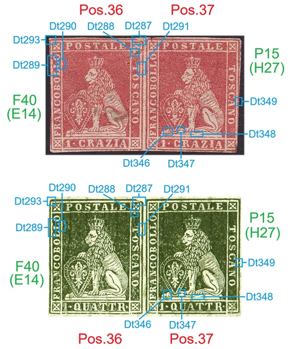 Come descritto graficamente nella figura 42 che segue, il francobollo di destra, quello in posizione 36, presenta tutte le caratteristiche della varietà F40 (E14). Da notare che questo francobollo rappresenta il nono esemplare di francobolli granducali di Toscana su filigrana del Secondo Tipo tra quelli reperiti, localizzati in posizione 36 e, come tutti gli altri in precedenza, è nella varietà F40 (E14), il che conferma la frequenza di ricorrenza posizione-varietà (Posizione Ricorrente) del 100%.