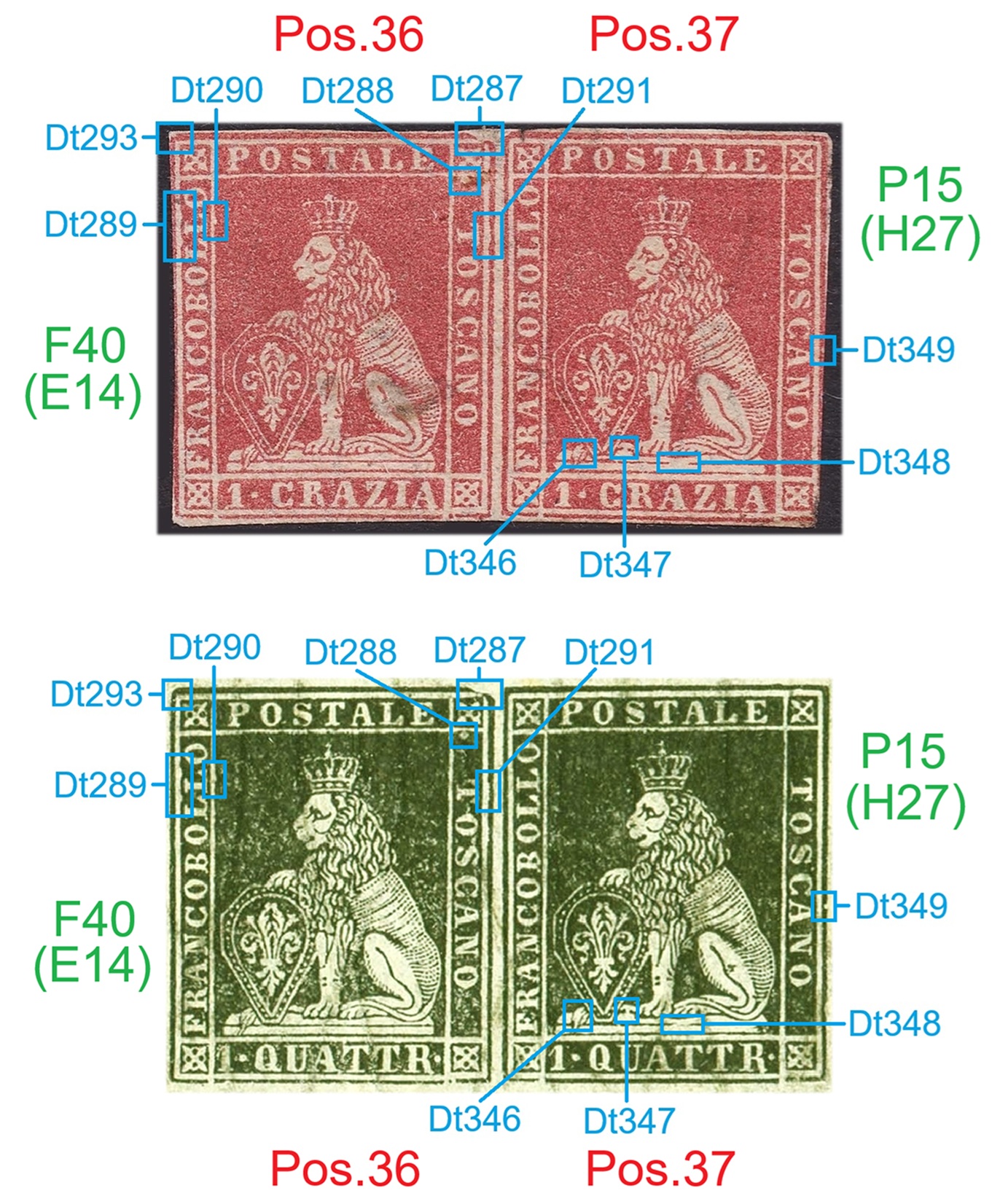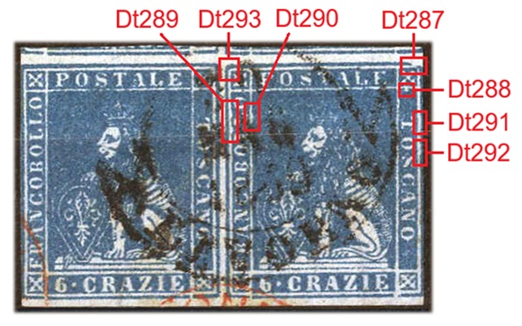 Nella figura 13 che segue abbiamo riportato la coppia del valore da 6 crazie introdotta con la figura 7, dove sul francobollo di destra sono stati evidenziati i sette dettagli caratteristici della varietà F40 (E14) riscontrati in questo esemplare Dt287-Dt293). Non tutti sono perfettamente visibili in quanto coperti dall'annullo (Dt288) o dei margini ridotti (Dt287). Come già dimostrato in figura 8, il francobollo occupava la posizione 36 del quadro di stampa.