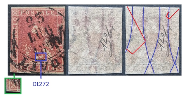 La filigrana dell'esemplare del valore da 6 crazie è nella configurazione BS-AD e i frammenti di lettere che si intravedono appartengono ai caratteri 'A' e 'N' della dicitura 'II E RR POSTE TOSCANE'. Utilizzando la tavola S08 si dimostra quindi la provenienza del francobollo di figura 17 e di conseguenza anche degli altri due francobolli di figura 16, dalla posizione 34, come evidenziato in figura 13.