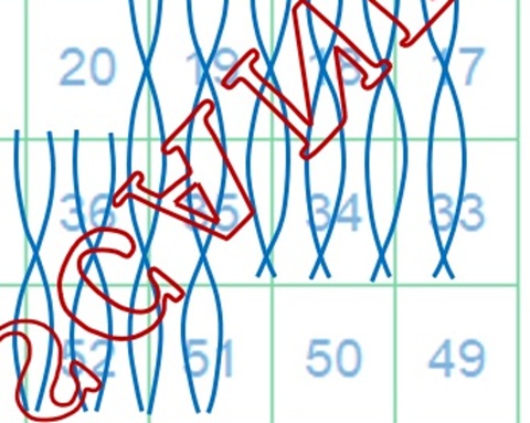 In particolare si può dimostrare che la perla completamente visibile appartiene al trittico apicale della Corona 1 (la prima in alto a sinistra di figura 8) e che le posizioni occupate in origine dai francobolli nel quadro di stampa erano la 14 e la 30. Ciò si ottiene confrontando la filigrana della coppia con la tavola S01, come visualizzato in figura 9.