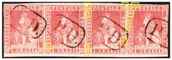 Come già fatto nell'articolo di introduzione alle Posizioni Ricorrenti, prendiamo come riferimento l'unico blocco integro conosciuto di francobolli granducali su filigrana del secondo tipo (blocco superiore dei tre in cui veniva suddiviso fisicamente il foglio completo di stampa). Ci concentreremo sui primi quattro francobolli da sinistra dell'ultima riga in basso, la quinta, corrispondenti alle posizioni 65, 66, 67 e 68 (figura 4).