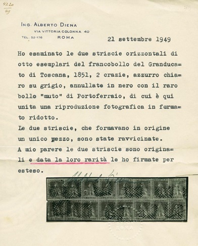 Le due strisce di francobolli sono corredate dal certificato redatto dall'Ing. Alberto Diena il 21 settembre 1949, oltre settantacinque anni fa quindi, documento che riportiamo nella figura 7 che segue.