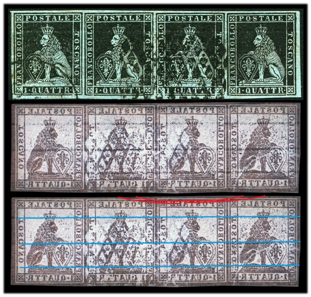 I francobolli che compongono la striscia appartenevano verosimilmente alle colonne 13, 14, 15 e 16 del foglio completo, ovvero la stessa si trovava al margine destro della composizione, come testimoniato inequivocabilmente dall'abbondante margine libero dalla stampa sul lato destro. La filigrana della striscia mostra tre linee orizzontali, che occupano verticalmente la parte centrale dei francobolli (in blu in figura 12) e una spessa linea curva, concava verso l'alto, chiaramente la parte inferiore di una corona (in rosso in figura 12), evidentemente quindi in configurazione Dritta. Osservando la composizione grafica completa della filigrana del Primo Tipo, si può dedurre che le linee riscontrate nella striscia in esame, non possono che essere quelle appartenenti ad esemplari provenienti dalla Riga 11 delle quindici di cui era composto il quadro dei 240 cliché utilizzati per la stampa dei francobolli toscani (figura 13).