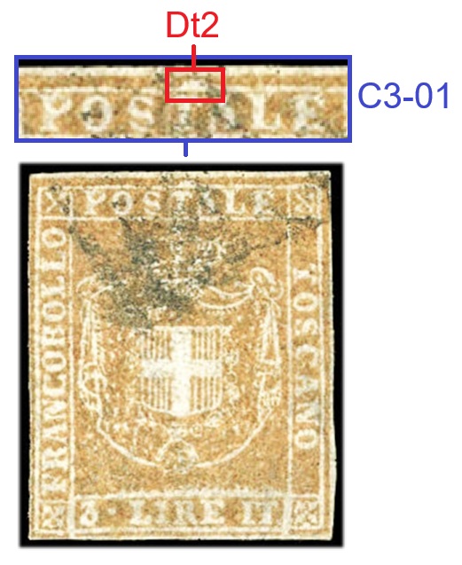 Vogliamo discutere il recente censimento di una ulteriore varietà dello stereotipo della vignetta dei francobolli emessi dal Governo della Toscana, in un esemplare del valore da 3 Lire, che si aggiunge alle 28 già descritte in questo articolo ed ai 40 francobolli del massimo valore nominale dell'emissione sabauda della Toscana preunitaria. Caso#29 − (1 esemplare) − C3-01 − Intacco interno cornice 3 Il francobollo è riportato nell'immagine di figura 63 e la varietà è quella che riguarda il Segmento 3 della cornice esterna, che abbiamo codificato come C3-01. Questa è caratterizzata dalla falla di colore sul lato interno in corrispondenza del carttere 'T' della Dicitura 3, dettaglio denominato come Dt2.