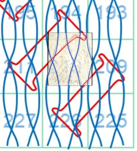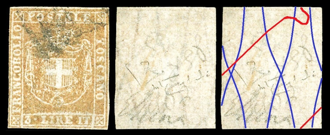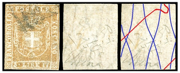 Il francobollo è particolarmente interessante in quanto, oltre ad essere l'unico fino ad oggi da noi rintracciato nella varietà C3-01, è anche del tipo fil-let, ovvero mostra tracce della dicitura 'II E RR POSTE TOSCANE' nella filigrana, come evidenziato nella figura 64 che segue, fatto che ci permette quindi di determinare la posizione che questo esemplare occupava nel quadro di stampa.