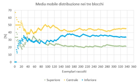 La media mobile della distribuzione degli esemplari nei tre blocchi, riportata in Figura 12 mostra che la maggiore frequenza per il blocco centrale è un dato che è rimasto costante durante tutta la raccolta. La frequenza di localizzazione negli altri due blocchi, dopo una iniziale eguaglianza, si è separata a favore di quello inferiore.
