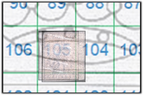 Il tassello del valore sembra anch'esso essere lo stesso per i due francobolli, supposizione supportata dalla presenza in entrambi in una piccola falla di colore a sinistra della lettera 'C' della parola 'CRAZIE' (dettaglio 1 di figura 1). Già di per sé un francobollo granducale originato dagli stessi cliché per la vignetta e per il tassello del valore è stato stampato verosimilmente con la stessa tavola di stampa, in quanto la probabilità che smontando e rimontando completamente la composizione dei 240 un dato cliché della vignetta finisca accoppiato con lo stesso cliché per il tassello del valore è decisamente molto bassa, anche se non nulla. La falla 1 potrebbe altresì essersi originata al momento della produzione della matrice metallica (passaggio 3) e non essere presente sin dall'inizio sul cliché originario. Proviamo a determinare la posizione che i francobolli occupavano nel foglio originario dei 240 esemplari. In figura 3 è evidenziata la filigrana dei due francobolli attraverso una scansione in trasparenza.