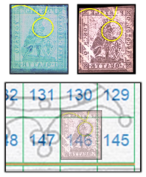 Entrambi i francobolli non possono essere posizionati nel quadro dei 240 esemplari utilizzando la filigrana come riferimento, in quanto non si scorgono tratti di lettere, ma gli elementi tipografici visibili al recto permettono l'assegnazione. La linea di chiusura della composizione, presente in entrambi gli esemplari, colloca inequivocabilmente il francobollo al margine sinistro del foglio ed il modo in cui questa termina nella parte inferiore, indica che si tratta dell'ultima riga in basso del foglio. È infatti noto, che la riga di composizione si interrompe in prossimità dell'angolo, terminando in modo obliquo, come accade in questi due casi. In entrambi i francobolli è visibile completamente la riga di composizione verticale a sinistra, mentre non vi è traccia di quella che chiudeva la composizione in basso.