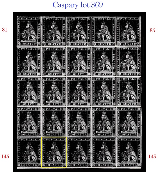 Proviamo a determinare la posizione dei due esemplari. La filigrana è identica per entrambi, è al Recto e Capovolta e mostra una delle perle della corona 6. Dal confronto con la tavola di riferimento S04 si ottiene che la posizione nel quadro di stampa era la 146, ovviamente per entrambi i francobolli (figura 22). Non ci sono quindi dubbi che i due francobolli di figura 20 furono stampati con la stessa tavola di stampa e che la posizione 146 di detta tavola è plattata con la varietà C30. In questo caso possiamo andare però molto oltre con il plattaggio della tavola di stampa. In figura 23 è riportato un blocco nuovo da 25 esemplari sempre del valore da 1 quattrino della su Filigrana del Primo Tipo, messo in asta nel 1957 a New York durante la dissoluzione della collezione curata da Alfred Caspary.