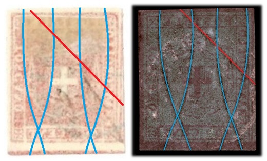 Nel caso di questi esemplari, la filigrana ci è di aiuto nell'individuazione della posizione nel quadro di stampa. Si tratta infatti per entrambi del caso di Angolo di foglio "I", ovvero, come evidenziato in figura 54, la filigrana mostra, oltre alle normali linee ondulate verticali, anche un tratto appartenente alla prima lettera "I" della dicitura.