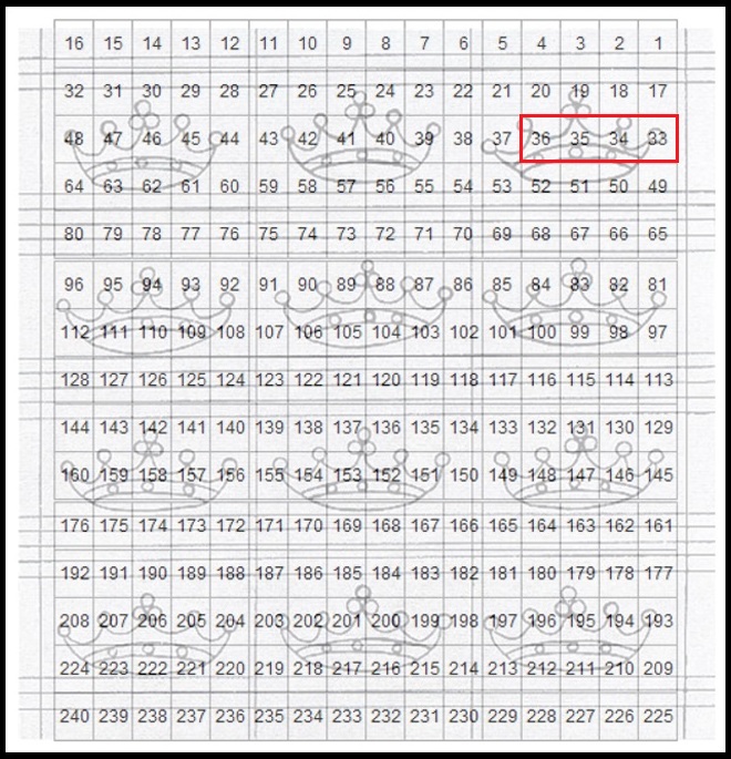 Il terzo passo consiste nella determinazione della posizione del francobollo sul foglio filigranato e si effettua confrontando il frammento di filigrana del francobollo visibile al verso con le immagini ottenute dalla sovrapposizione del disegno della filigrana (matrice di filigrana o Sovrapposizione di riferimento) con il quadro delle 240 posizioni (Tavola delle posizioni), scambiate da sinistra a destra. Detto scambio è necessario per il fatto che, come detto sopra, stiamo osservando la filigrana dal verso del foglio di stampa. Si deve individuare ed utilizzare l'appropriata Sovrapposizione di riferimento tra le 4 disponibili, a seconda della modalità che era stata utilizzata per la stampa, secondo lo schema che segue: