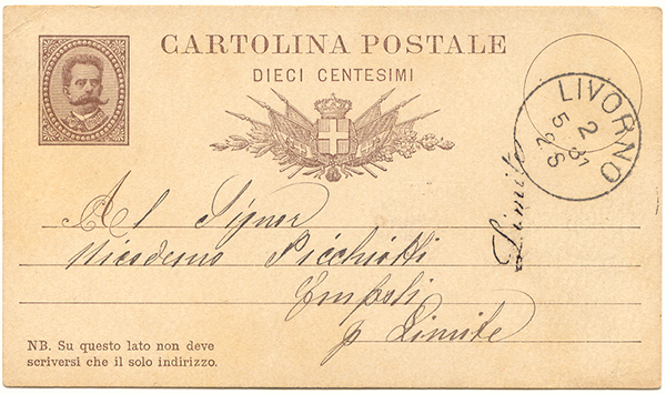 | 2 maggio 1881. Cartolina postale da Livorno a Limite, ove fu apposto il lineare corsivo in arrivo. Da notare l’indicazione del mittente “Empoli per Limite”, ad indicare che la località dipendeva dall’ufficio di Empoli, dal quale la corrispondenza doveva transitare. |