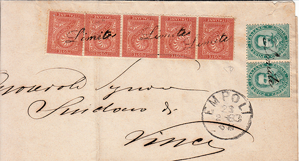 | 23 febbraio 1883. Grande frammento di plico che presenta il bollo di Limite impresso quattro volte come unico annullatore di striscia del 2 cent. cifra e di coppia del 5 cent. Umberto, con a lato il bollo di Empoli dal quale la collettoria dipendeva. |