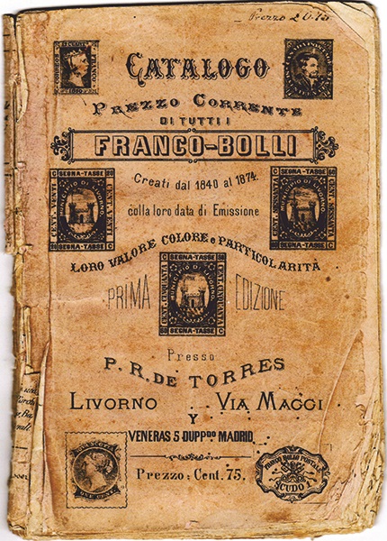 Va ricordato, poi, lo spagnolo “Placido Ramon de Torres” (1847 – 1918) a lungo residente in quel di Livorno, dove oltre a pubblicare la prima rivista filatelica italiana “ La Posta Mondiale “ a partire dal luglio del 1873 di cui uscirono solo dodici numeri, curò anche l'edizione di un catalogo – prezzario dei francobolli emessi dal 1840 al 1874. (Fig. 4)