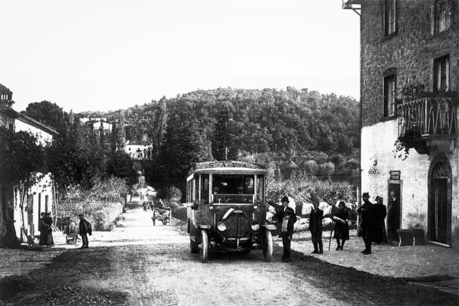 CAPANNOLE - 1921 - Questa immagine ritrae uno scorcio del Sodo e alcuni capannolini che prendono la S.A.V.A. per andare forse a Bucine o addirittura a Montevarchi. La corriera è ferma davanti alle Regie Poste.